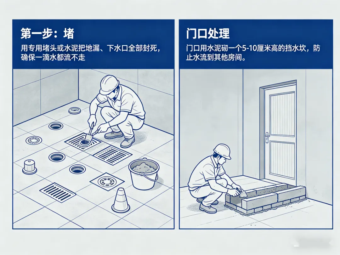 第一步:堵。 用专用堵头或水泥把地漏、下水口全部封死,确保一滴水都流不走。门口用水泥砌一个5-10厘米高的挡水坎,防止水流到其他房间。