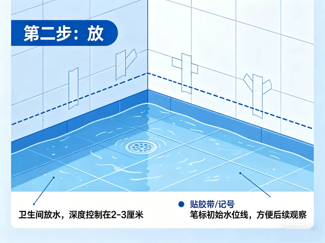 第二步:放。 卫生间放水,深度控制在2-3厘米就够了,不用放太深。在墙上贴胶带或用记号笔标出初始水位线,方便后续观察。