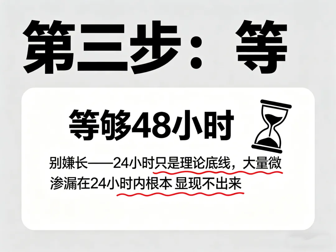 第三步:等。 等够48小时。别嫌长——24小时只是理论底线,大量微渗漏在24小时内根本显现不出来。