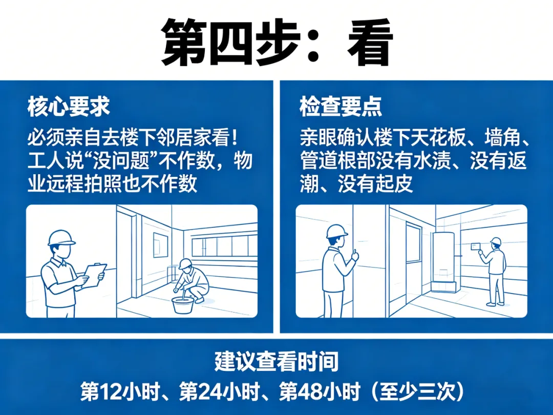 第四步:看。必须亲自去楼下邻居家看! 工人说“没问题”不作数,物业远程拍照也不作数。你得亲眼确认楼下天花板、墙角、管道根部没有水渍、没有返潮、没有起皮。建议至少去看三次:第12小时、第24小时、第48小时。