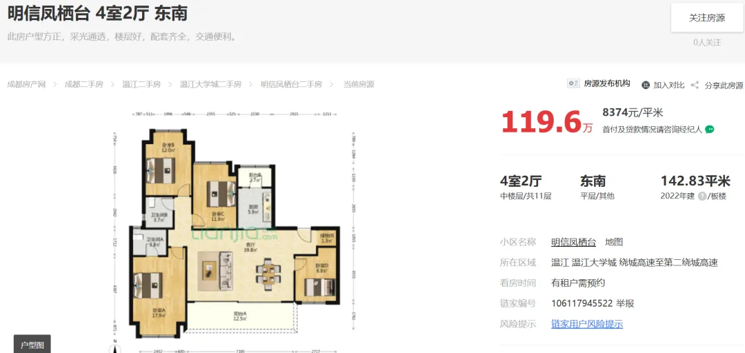 2026年04月10日,据市场端消息:成都温江大学城,明信凤栖台建面143平套四报价120万;目前房东心里价在120万愿意出售。