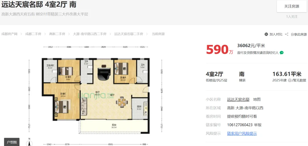 2026年04月01日,【那坊归心】成都高新新川存量房(二手房)天恒傲云天府建面169平套四报价429万,是否适合90后?