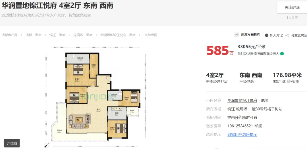 2026年04月10日,据市场端消息:成都锦江琉璃场,华润锦江悦府建面177平套四报价585万;目前房东心里价在585万愿意出售。