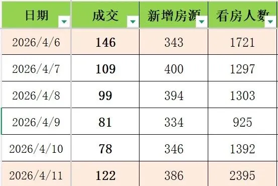 清明节过后的这一周,成交量明显是回落的,单日最低成交78套,另外还有两天也不过百套,分别卖了81套和99套,昨天周六是略有反弹到122套。但单日不过百的次数已经增加到了三次。