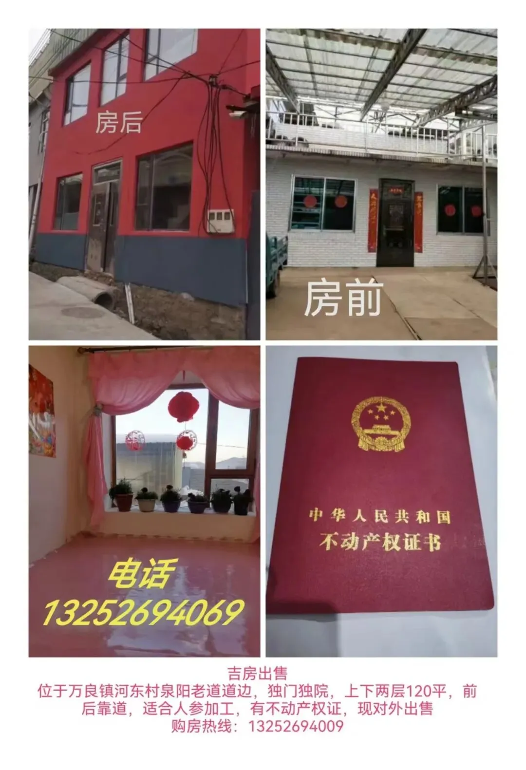 自住房出售🏡🏡 位于万良镇河东村泉阳老道道边,独门独院,上下两层120平 前后靠道,适合人参加工,有不动产权证,现对外出售,价格面议,可以过户,非诚勿扰, 购房热线:13252694069
