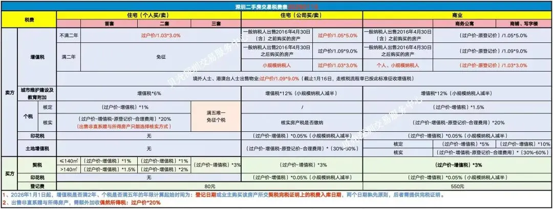 长期以来,二手住宅交易最大额的就是增值税及附加,原先合计为5.3%。26年1月1日以后增值税由5%→3%,附加税也随之由3%→0.18%,故而,26年起,增值税及附加由原来的5.3%→3.18%,满二年直接免征。(表格中的1.03分母为深圳的缩放系数,具体请根据城市不同注意甄别。)