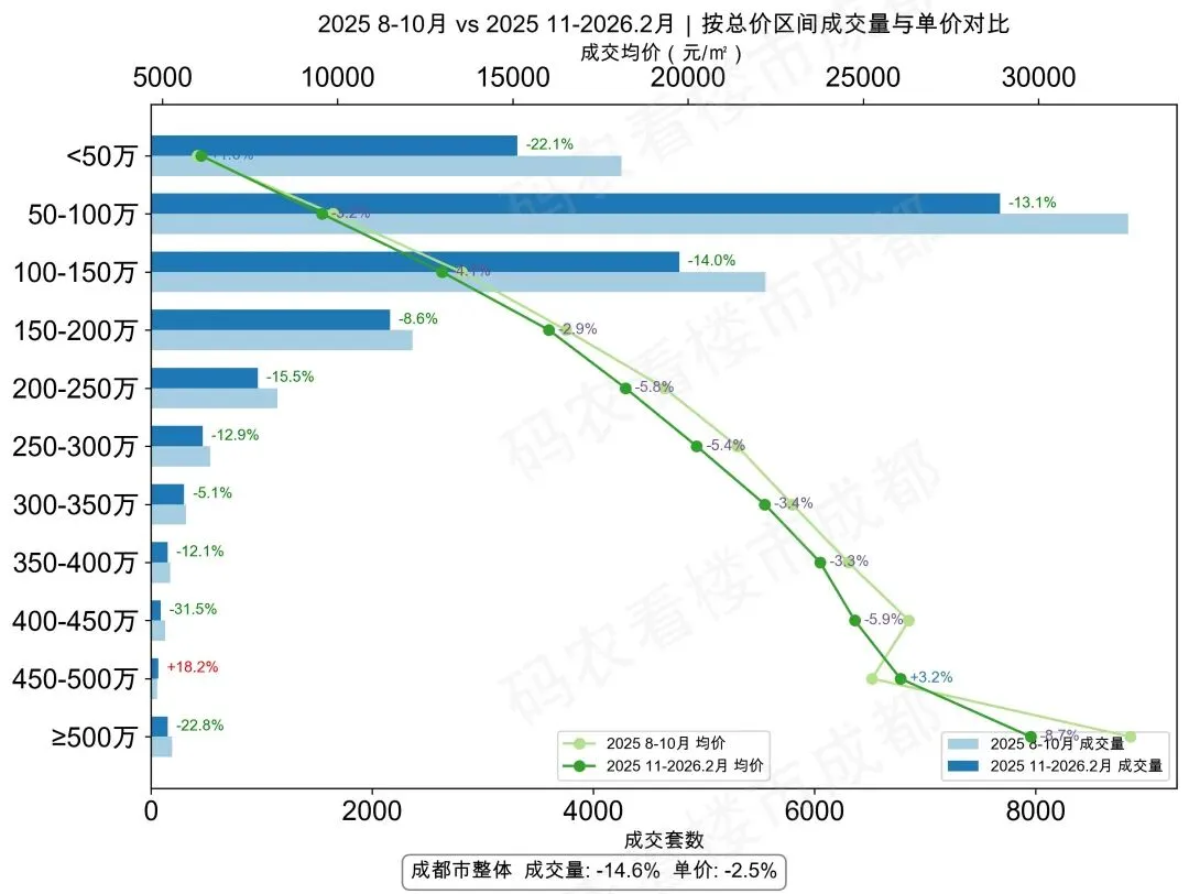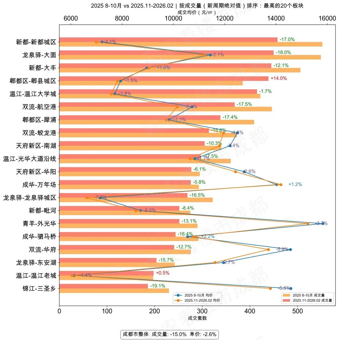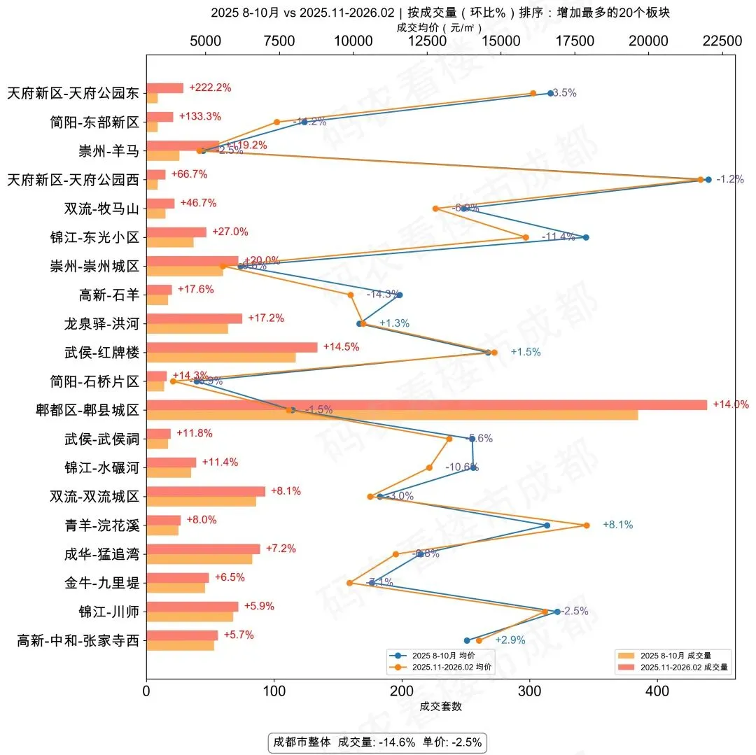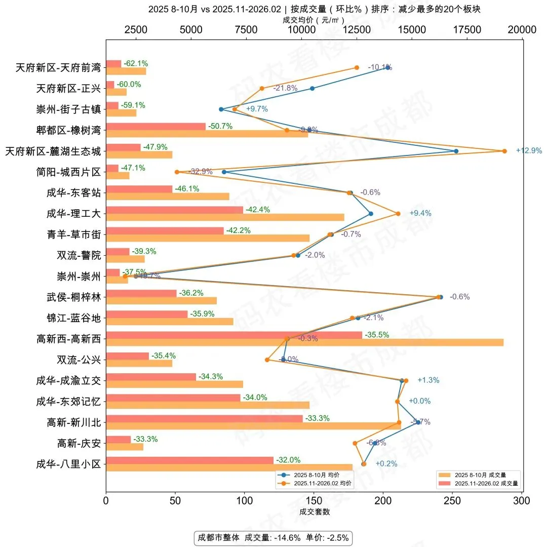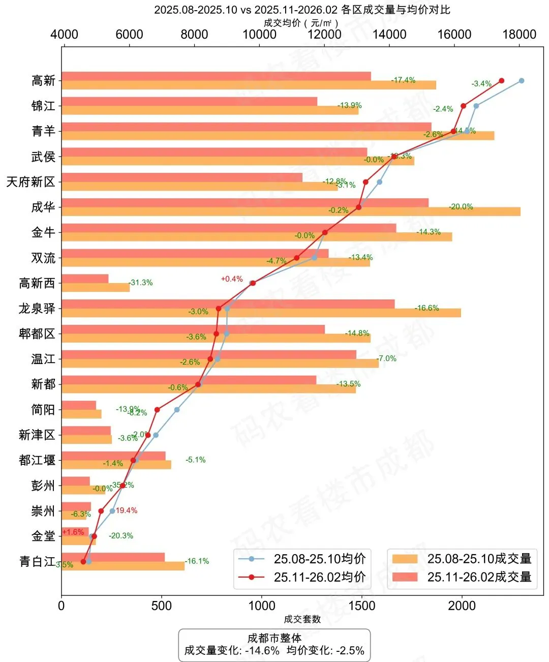 到 2 月底为止,成都二手房整体成交量比上一阶段少了 14.6%,成交均价也回落了 2.5%。