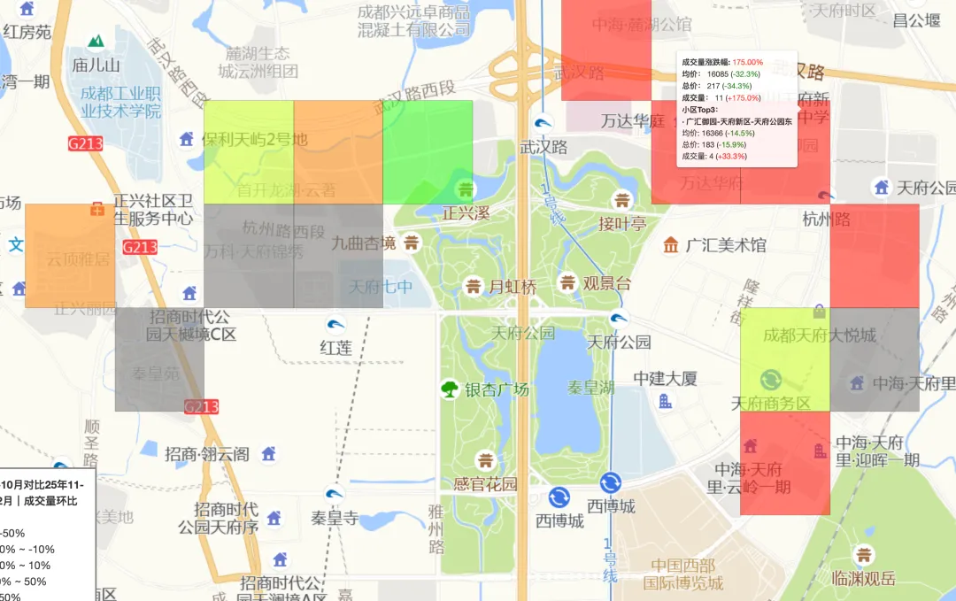 如果只看成交量最高的那些板块,会发现一个很直接的现象:原来最活跃的地方,也开始放慢了。比如新都城区、龙泉驿大面、双流航空港、天府新区南湖、温江光华大道沿线,这些一直成交比较高的板块,这一轮大多都在回落。