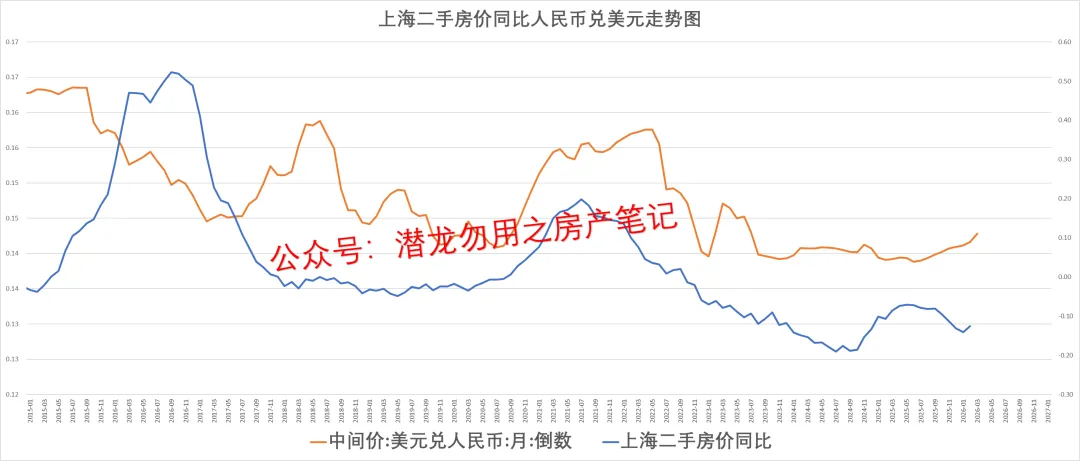 下图是过去10年,上海二手房价同比(中原地产上海房价指数,2002年1月初始值1000)与人民币兑美元汇率的复盘,数据仅供参考,背后的逻辑关系自行总结。