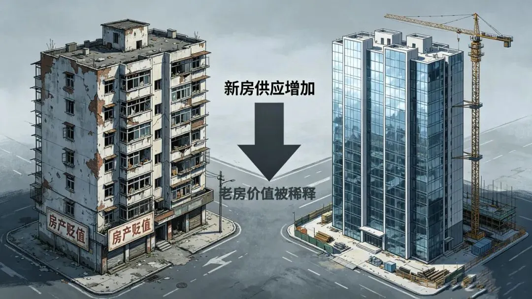 有更好的户型、更优的物业、更新的配套。对比之下,而存量房的竞争力会被持续挤压。尤其是对于绝大多数:远郊新房、老破小、三四线房产而言,供给过剩的压力会不断增大,价值不断被新房稀释,越持有越被动。