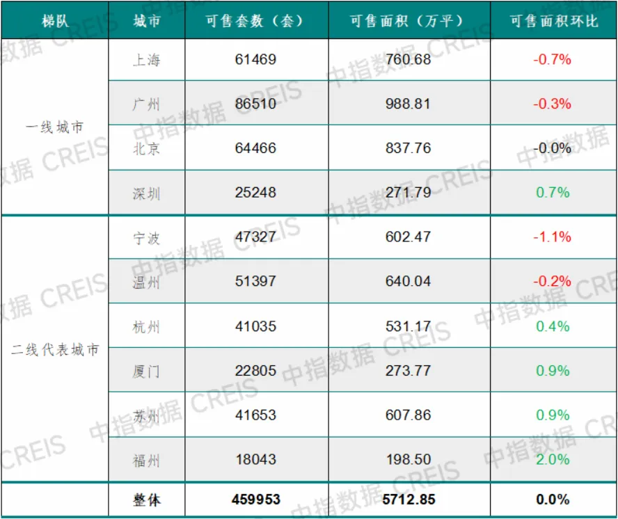 监测的10个代表城市上周新房可售面积环比基本持平。一线城市中上海, 广州, 北京可售面积环比下降,深圳环比增长;二线城市中宁波, 温州可售面积环比均下降,去化速度较快。