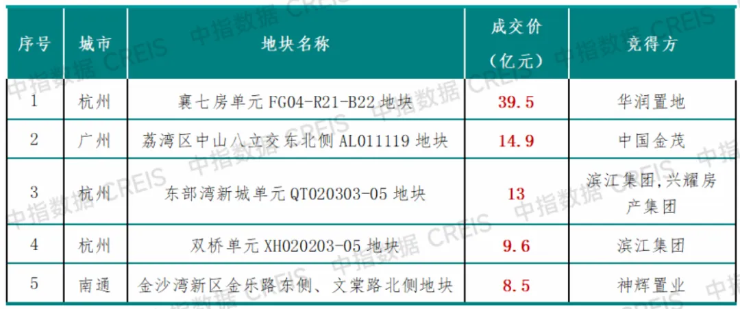▍宅地总价TOP5:杭州宅地地块成交价居首位,TOP5中一线城市地块占一席