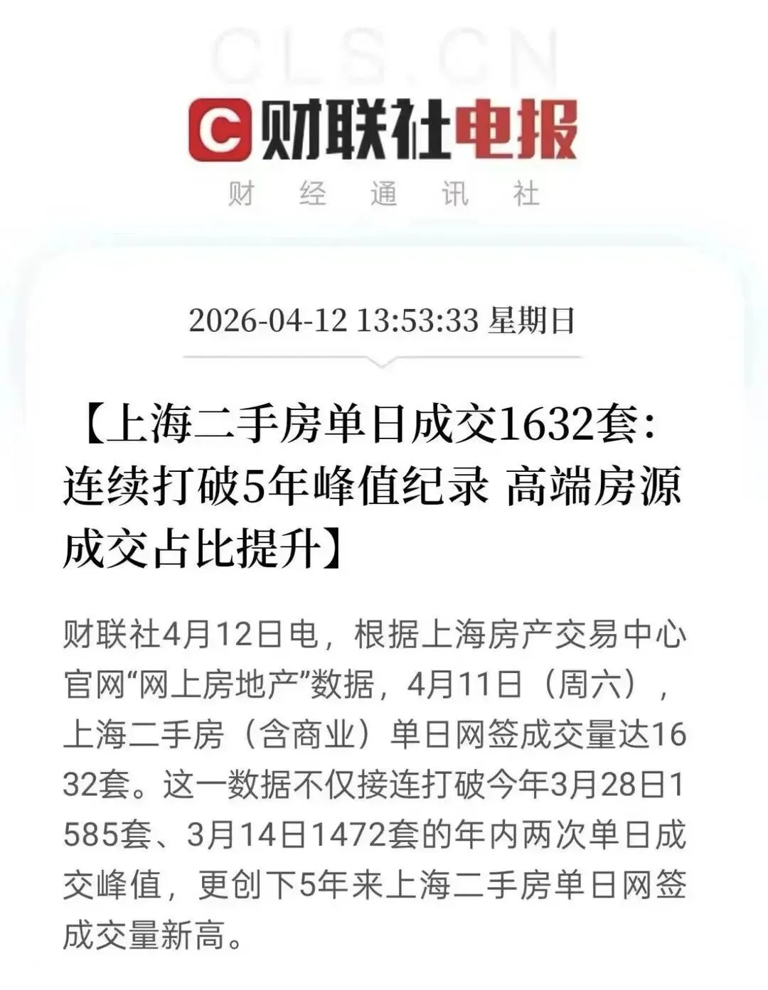 上海二手房单日成交1632套:连续打破5年峰值记录!