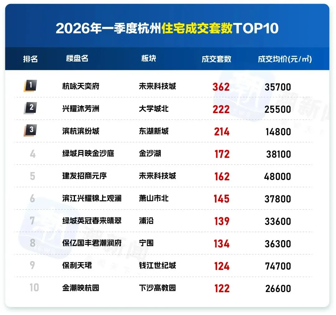 最近一季度杭州住宅销售榜单出炉,结果有些出人意料。未来科技城的保利天奕以362套登顶成交套数榜首,建发元序以162套位列第五。成交金额榜上,这两个未科新盘同样跻身前五——天奕第2,元序第4。