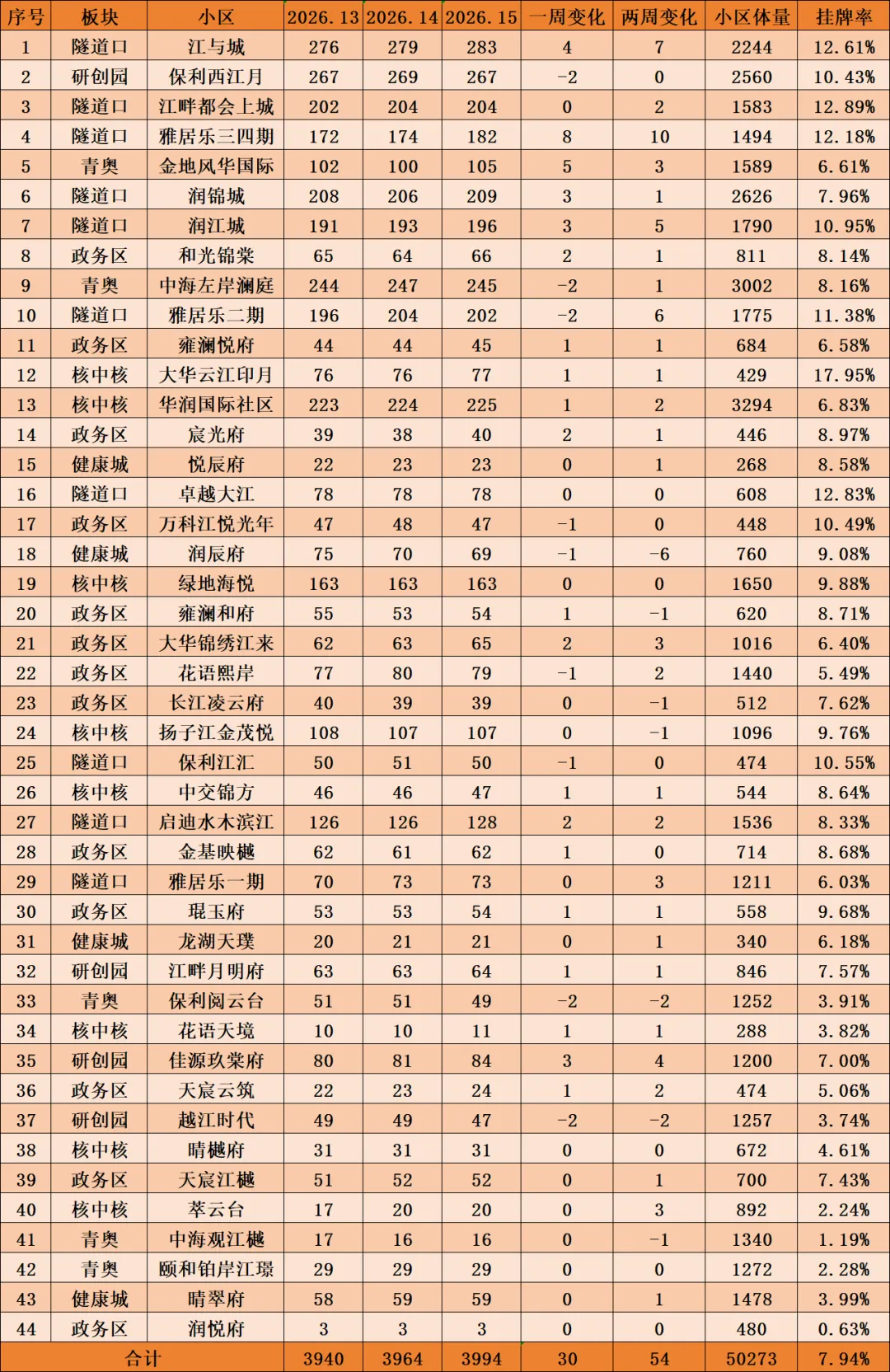 上周江核二手房挂牌量增加30套,挂牌量连续八周增加,连续三周明显出现了挂牌量上涨,前两周赖滨江,这周锅只能甩给行情了,这么多经纪人,又没能力成交,只能从房源端发力,多挂点房子,确保在行业低谷期能活下去。