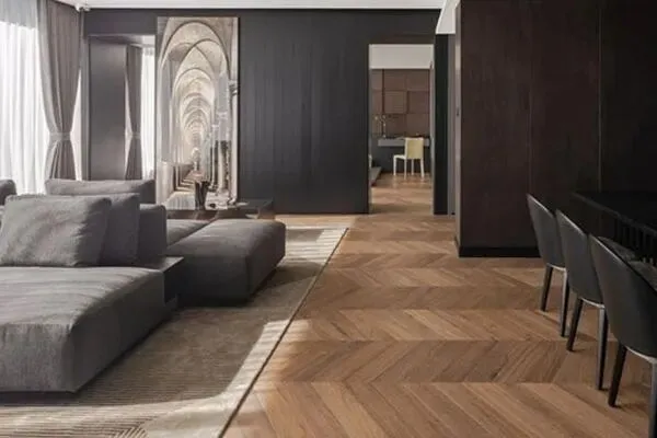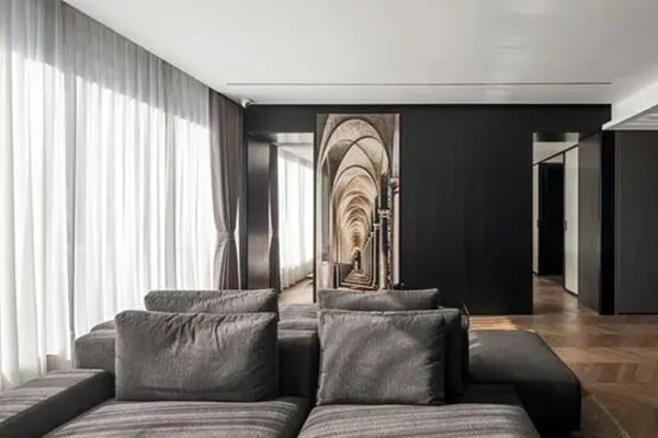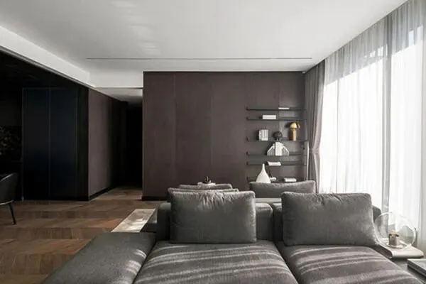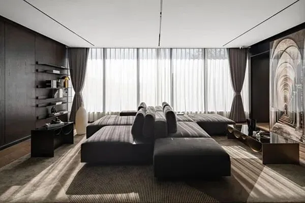 在家的心腹之地落脚了。在那刹那间,宛如是让人对这个简约的客厅一见钟情了。设计师Felix在此,沿袭了空间色彩调性,黑色是它的主色调,一组可以灵活组合的黑色沙发,一面黑色胡桃木的墙面,一张简致的茶几,就这样将一处动线灵活,结构均衡的客厅空间塑造了。有趣的是,设计师Felix消除了客厅原有的边界感,将沙发放置在中心,两侧是对称的布局,让空间的陌生感得以消弭了。在这间典雅的客厅里,没有一成不变的动线,没有墨守成规的格局,有的是一种现代灵韵质感。客厅的面积富裕,在此,空间渐次轻盈,也渐次晴朗,它美得如此简约,也传递出了现代设计的少即是多的理念,在同时间,这客厅里,也流淌出了现代家庭生活的优雅韵味,叙述出家永不落幕的戏剧故事,将精神的乌托邦缔造了。