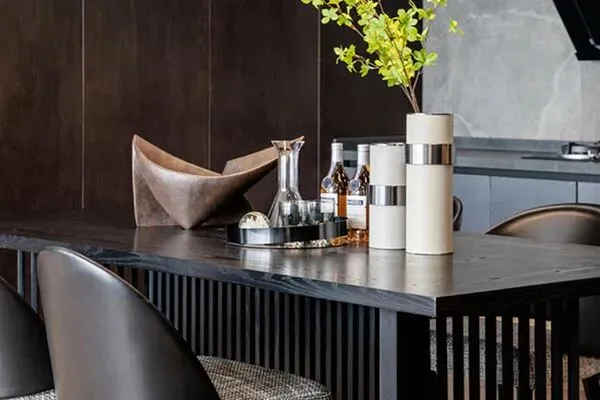 移步到了餐厅空间。餐厅的面积适中,然而,设计师Felix在此,也将匠心的独到之处彰显无疑了。依旧是黑色系,一张简致的黑色胡桃木餐桌,与四张黑色的澹雅餐椅,不仅在色彩上交相辉映,也在细节之处互相眺望了。真是与细节,见非凡。这张餐桌,它采用了卓绝雅致的传统手工艺打磨,在每一个细节之处,都满载着别具一格的匠艺了。在餐桌上的精美餐具,均来自于法国高端品牌,散发出优质的俊雅之感。而餐桌上的一捧鲜花,又将这温和的餐厅里,装点出几分自然的盎然妙趣,让用餐也变得至臻有趣了。设计师Felix借助这一张简约的餐桌,将美好的日常生活承载了。当Alan在此乐享美食的时候,他也在寻味着深圳这座城市的曼妙滋味了,家也平添了几分端庄与内敛的气韵来。这间巧妙的餐厅,它勾勒出了家庭生活的温雅之味了。