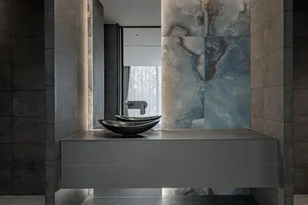来到了家的卫浴间。这间卫浴间面积不小。设计师Felix将黑色一以贯之,将干湿空间进行了分离。在一个光洁明亮的洗手台上方,是一面秀丽尔雅的镜子,一侧则是洗浴空间了。当Alan来到此处,打开高端的龙头,轻盈温雅的水珠,慢慢流出,在这时,好像也把身上的负能量洗去了。在高级精油的使用之下,让这小巧的卫浴间也一室芳香,让人顿时松弛与放松。毋庸赘言,这间卫浴间是家里最为静谧的空间,也是让Alan重获力量的空间之一了,它让人倍感自己自洽了。