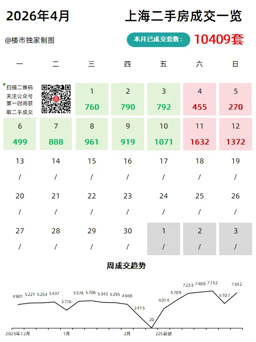 昨日(4月12日),上海二手房合计网签1372套(含住宅、商业、车位等)。最终4月累计成交10409套!