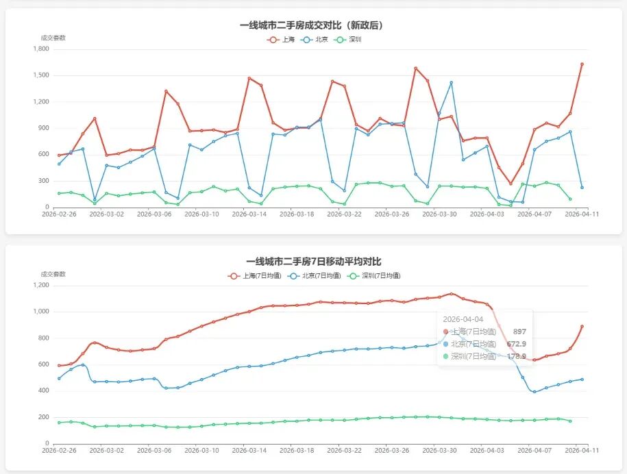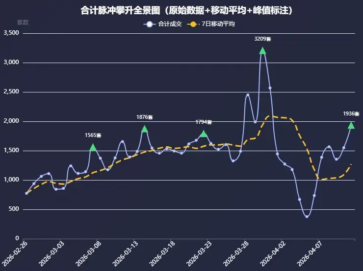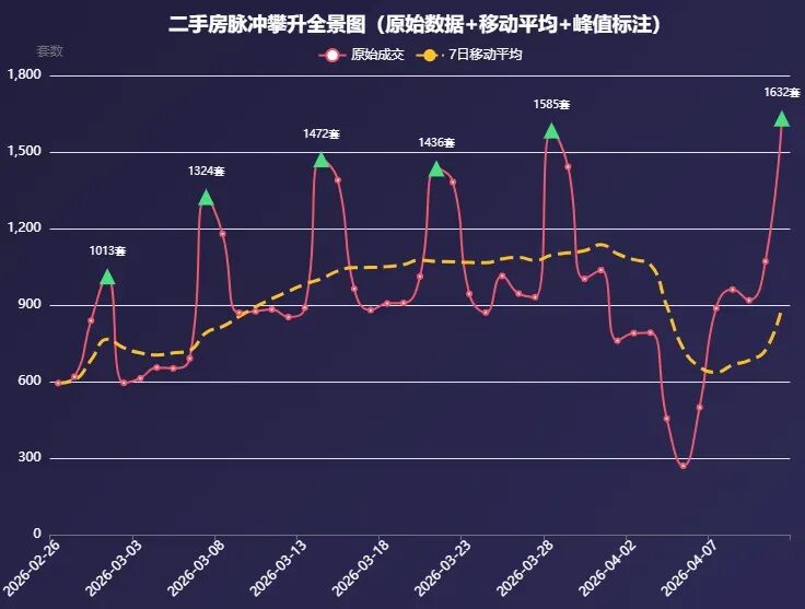 根据我们对上海二手房成交数据的分析,政策后45天内(2026年2月26日至4月11日),上海二手房市场呈现明显的脉冲攀升特征:
