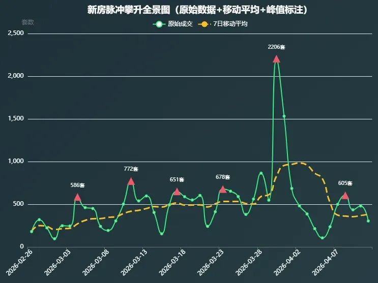 新房市场同样呈现脉冲特征,但幅度明显低于二手房: