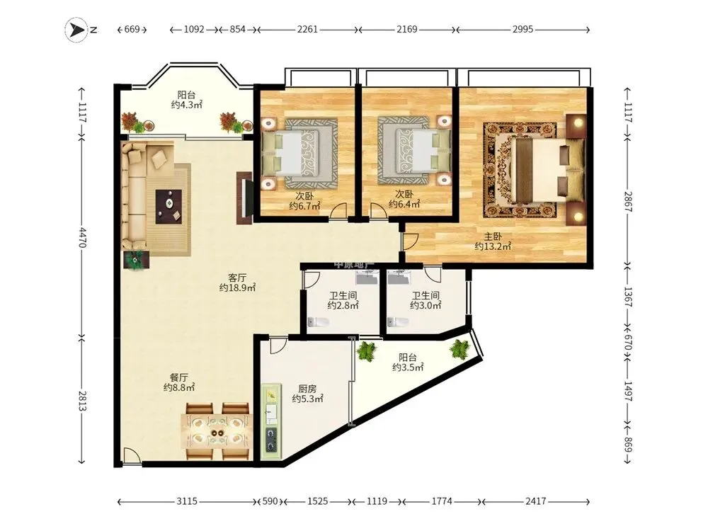 ◆港田花园89平米.3房2厅2卫阳台户型,视野开阔,采光非常好.