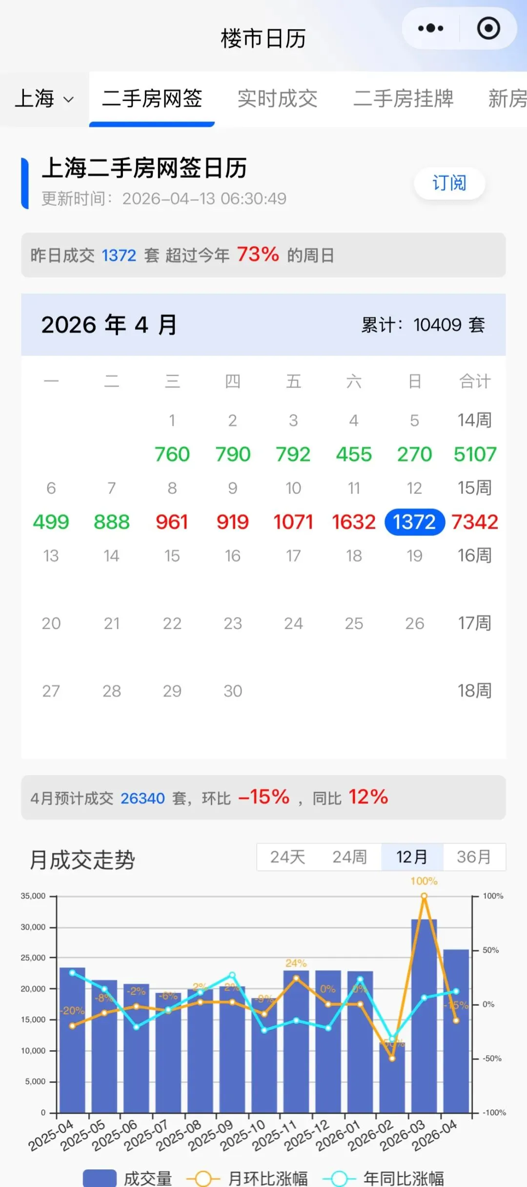 1️⃣ 单日成交破千: 4月12日网签量达到1372套,超过了今年73%的周日。截至12日,本月累计成交已破万套(10409套),平均每日成交接近900套,市场情绪依然高涨。
