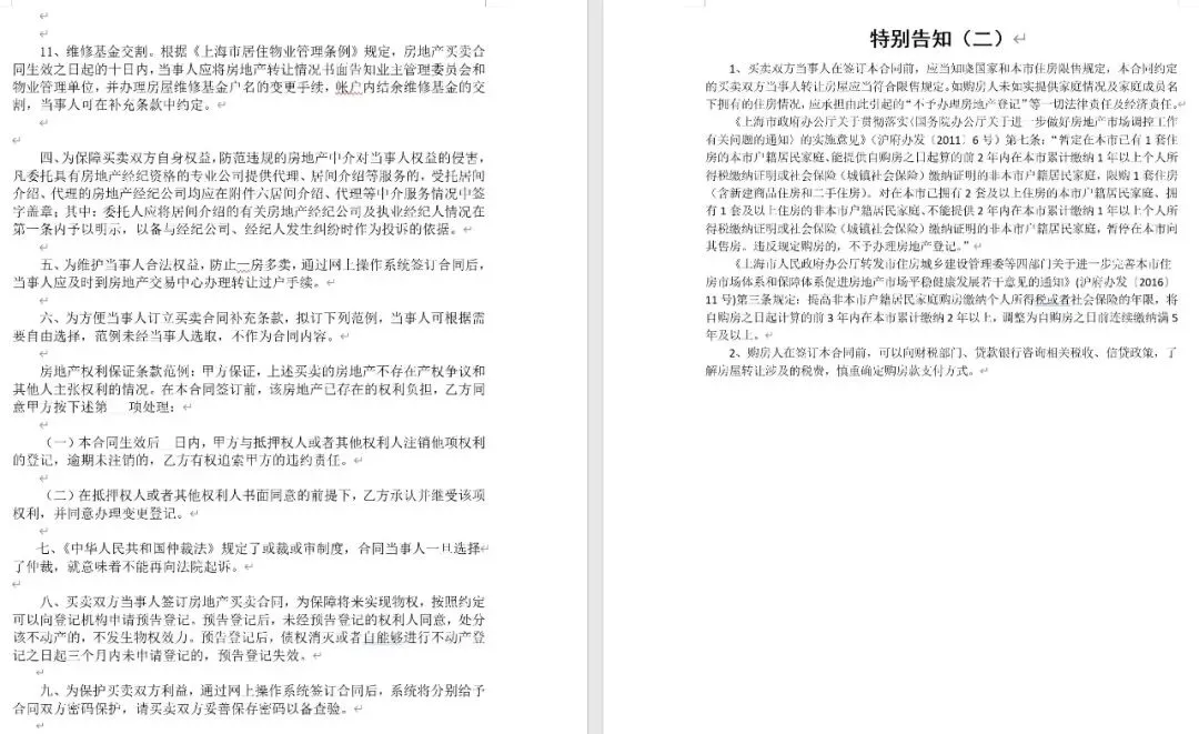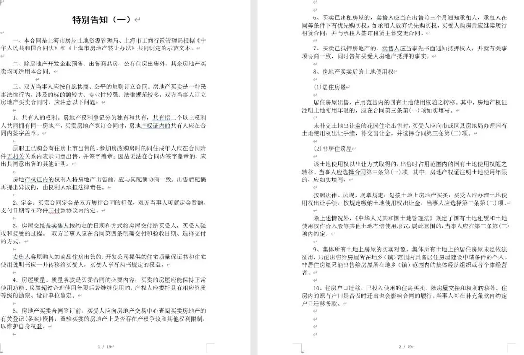 封面咱们就不看了,直接进入正文哈,正文的前面是两个特别告知,期中《告知一》主要讲了一些签约前的注意事项和关注重点,咱们重点强调一下第三款第4点与第三款第8点,其它的相信多数中介机构都会讲到,而这两点基本没有人告知。主要是因为多数房屋还没有到期,但是,随着时间的推移,尤其是第三款第4条,相信很快就会碰到。