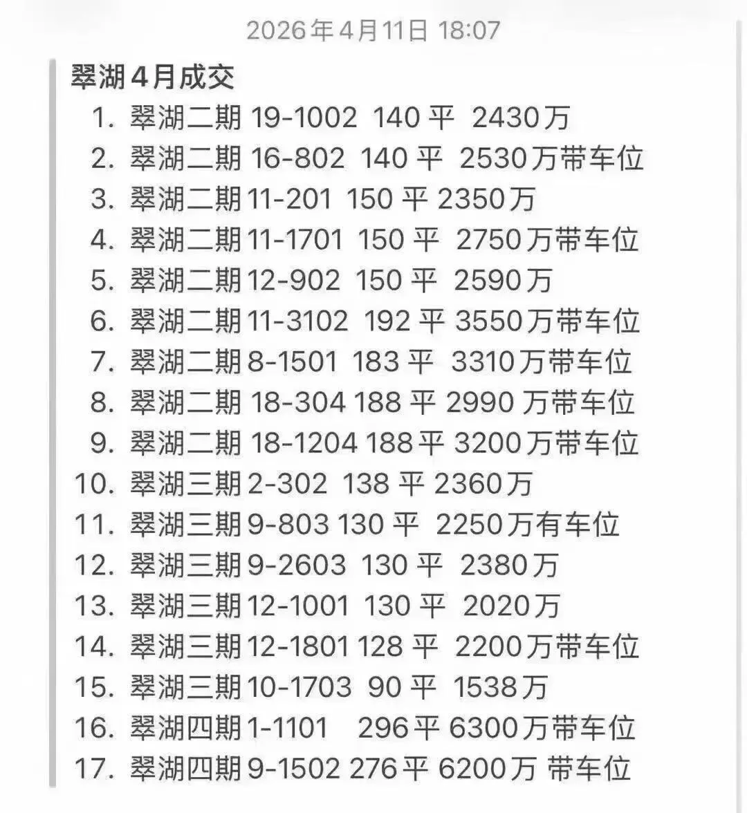 翠湖新天地,截止到本月11日已经成交17套,平均每天成交1.5套,今年已经成交了30多套。(2025年翠湖全年成交不过80套)。
