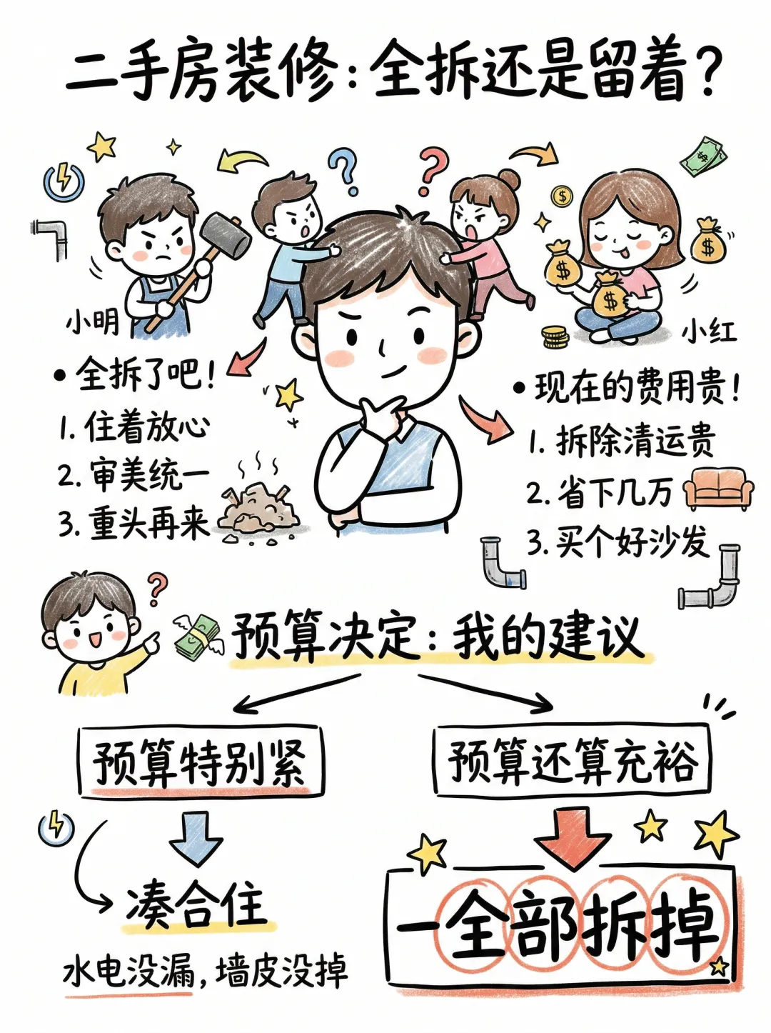 如果你的预算特别紧,只要水电没漏、墙皮没掉,那就先“凑合住”。但如果你的预算还算充裕,我的建议只有四个字——一全部拆掉。