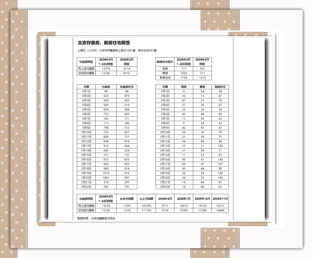 成交规模激增:2026年1月北京二手房网签量达15082套,连续三个月站稳1.4万套以上;较近10年同期均值高2000余套;截止3月23日,3月22日新房住宅网签63套,3月共1739套,环比2月上升96.94%。二手住宅网签191套,3月共13376套,其中住宅12182套,环比2月上升112%。