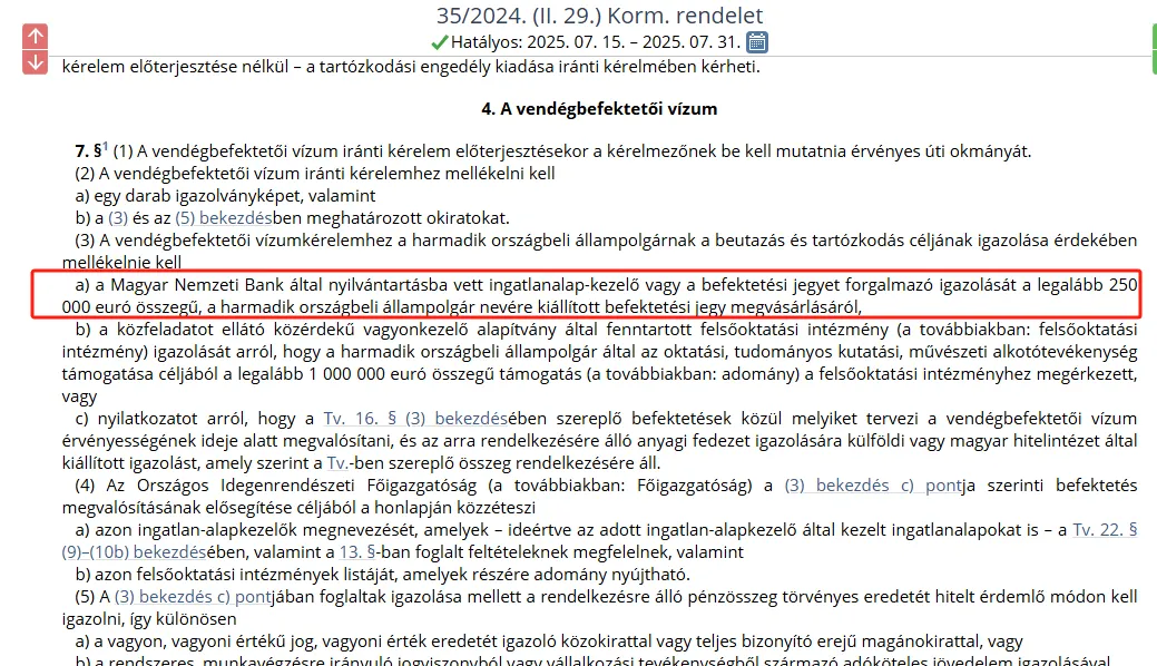 2024年7月1日匈牙利移民局开始接受匈牙利房产基金长居项目申请,法案要求申请人购买25万欧元由匈牙利政府认可的房地产基金,此基金是由匈牙利国家银行监管的。匈牙利国家银行(Magyar Nemzeti Bank,MNB)负责监管在匈牙利运营的各类基金,其中包括的主要房地产基金:OTP Ingatlan Alap, Raiffeisen Ingatlan Alap, Gravitas Real Estate Fund及其他这些基金通常投资于住宅、商业、办公和工业地产,旨在通过租金收入和资产增值为投资者提供回报。