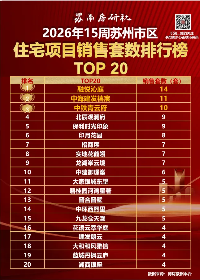 没有了回购和政策性签约,第15周苏州新房网签成交的前三甲是吴中太湖新城的融悦沁庭、新区狮山的中海建发禧宸以及吴江城北的中铁青云府。