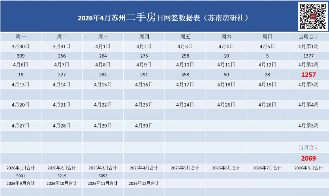 第15周苏州的二手住宅成交套数1257套,环比上周降幅8.71%。4月至今,苏州二手房网签成交2069套。