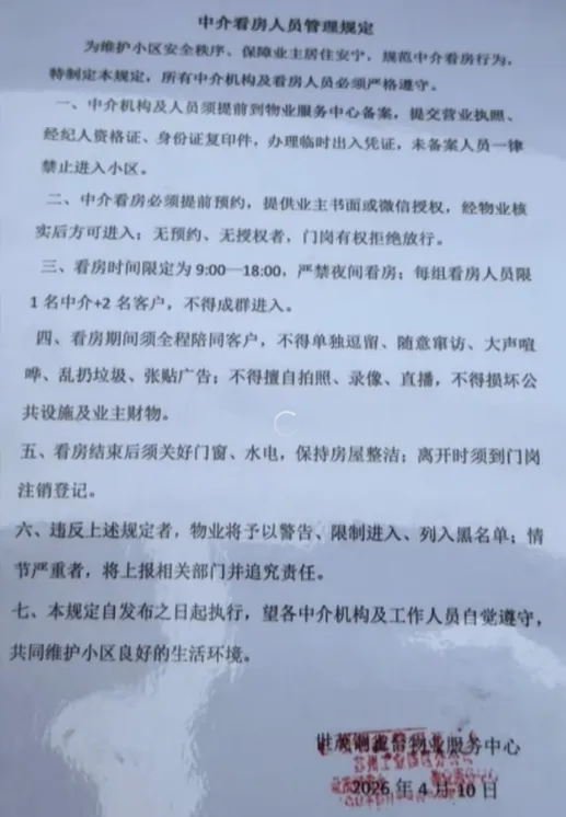 也许是铜雀台的成交热度太高,看房的人和中介比较多,不知道是不是打扰到了业主或者物业,昨天铜雀台的物业专门出了一个中介看房管理通知。