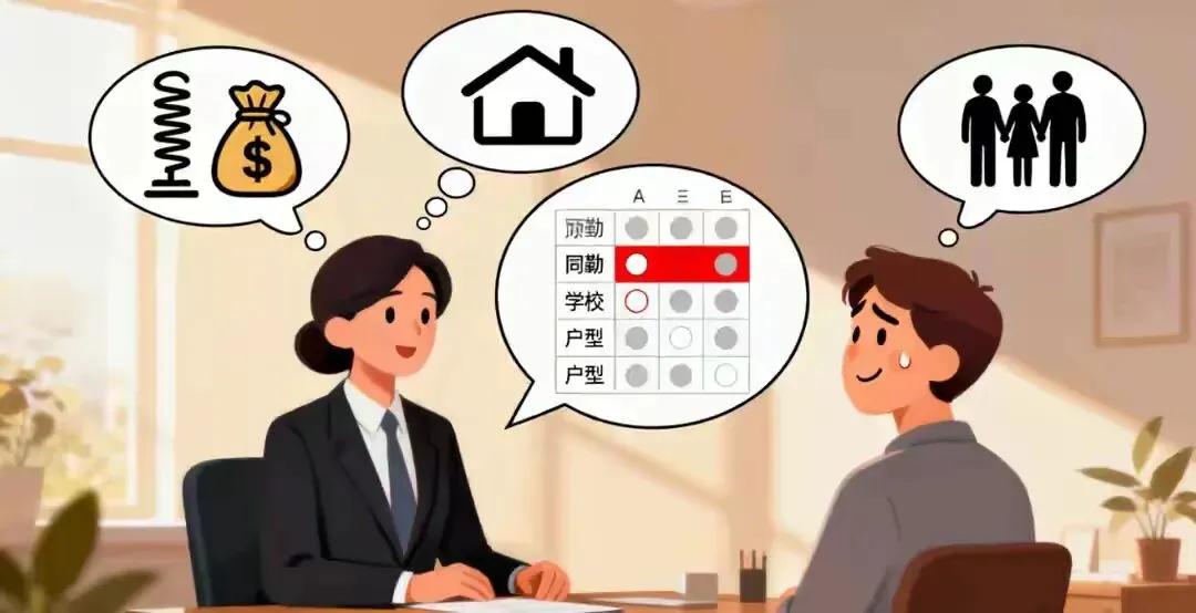 所以,他们现在最需要中介做的,不再是“你手里有多少套房”,而是“你能不能帮我理出头绪”。一个靠谱的中介,开场白不再是“您想要什么样的房子?”,而是像朋友聊天一样问:“您为啥想现在换房?最想改善生活里的哪一点?如果预算有限,学区、面积、通勤时间,哪个是您绝对不能让的?” 他们会用这种聊天式的提问,帮你把“想要三房”这种表面要求,挖出背后的真实需求——比如“想给老人留个房间”或者“孩子得有个安静的书房”。他们的价值,首先是帮你搭一个清晰的框架,分清什么是“一定要的”,什么是“可以商量着换的”。