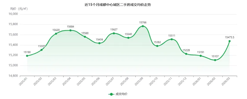 回顾近1年价格走势,成交均价在2025年9月触及阶段高点15766元/㎡后持续回落,至2026年2月降至15107元/㎡,累计回调约4.2%。3月的反弹力度较强,一举收复前两个月跌幅,价格重回15400元/㎡以上。
