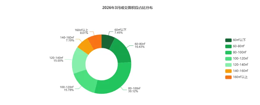 80-100㎡仍为绝对主力,大面积段占比环比提升,刚改&改善需求回暖信号明确。