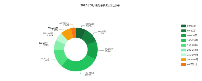 100-150万元仍是核心成交带,300万元以上高总价段占比从9.9%升至11.66%,改善市场明显升温。