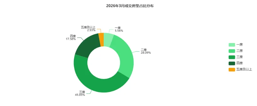 三房户型占比45.85%稳居主力,四房占比提升至17.58%,改善需求持续增强。 一房户型占比从7.33%降至5.56%,降幅明显,表明小户型需求进一步萎缩,市场重心向居住改善型产品倾斜。