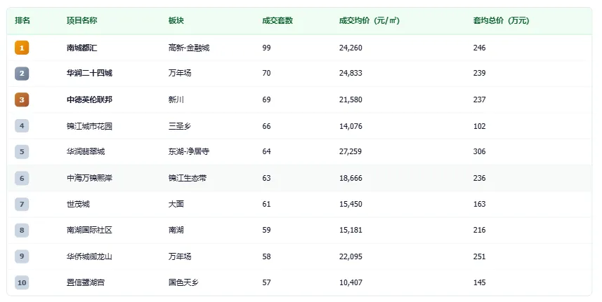 锦江城市花园套均仅102万元,是典型刚需盘代表。TOP10项目主要集中在高新南、万年场、新川、三圣乡等成熟板块,品牌房企项目占据主导。