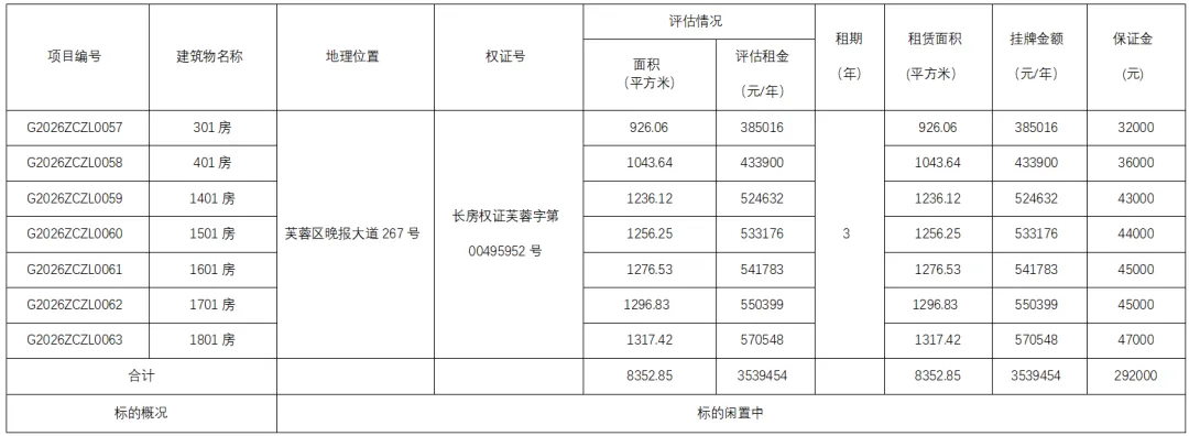 请有意承租人在公告期内到我所业务一部进行承租登记申请,并于4月28日16:00前交纳交易保证金(详见挂牌公告)[以到达我所指定账户为准。保证金指定账户:竞买人在“湖南省(长沙市)国有资产资源交易平台https://zczy.csggzy.cn/portal/index”,点击项目报名生成保证金子账号],通过资格确认后获准参与(网络)竞价,竞价时间为2026年4月29日上午10:00-11:00。