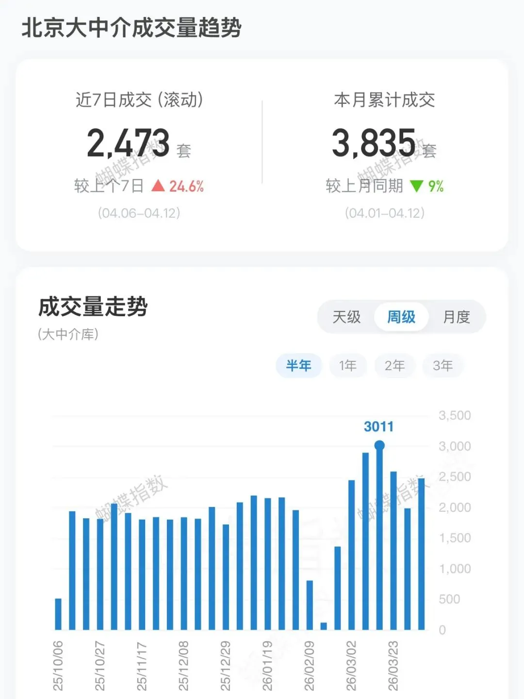 上周新房实时成交 2473套,二手网签 3835套。