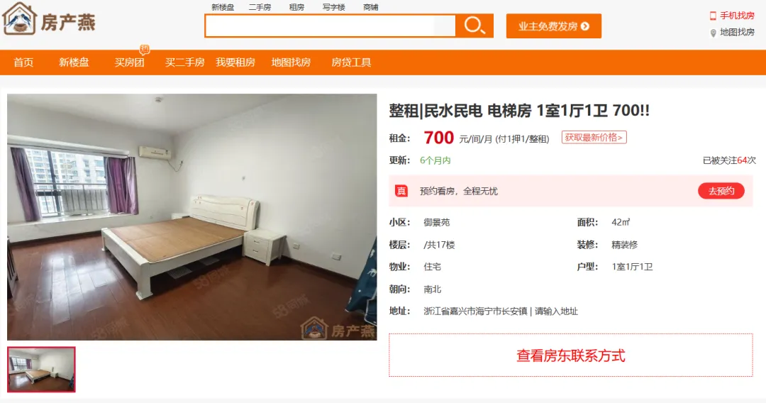 >找房子→房产燕丨御景苑 700元/间/月 42平米 整租|民水民电 电梯房 1室1厅1卫 700!!
