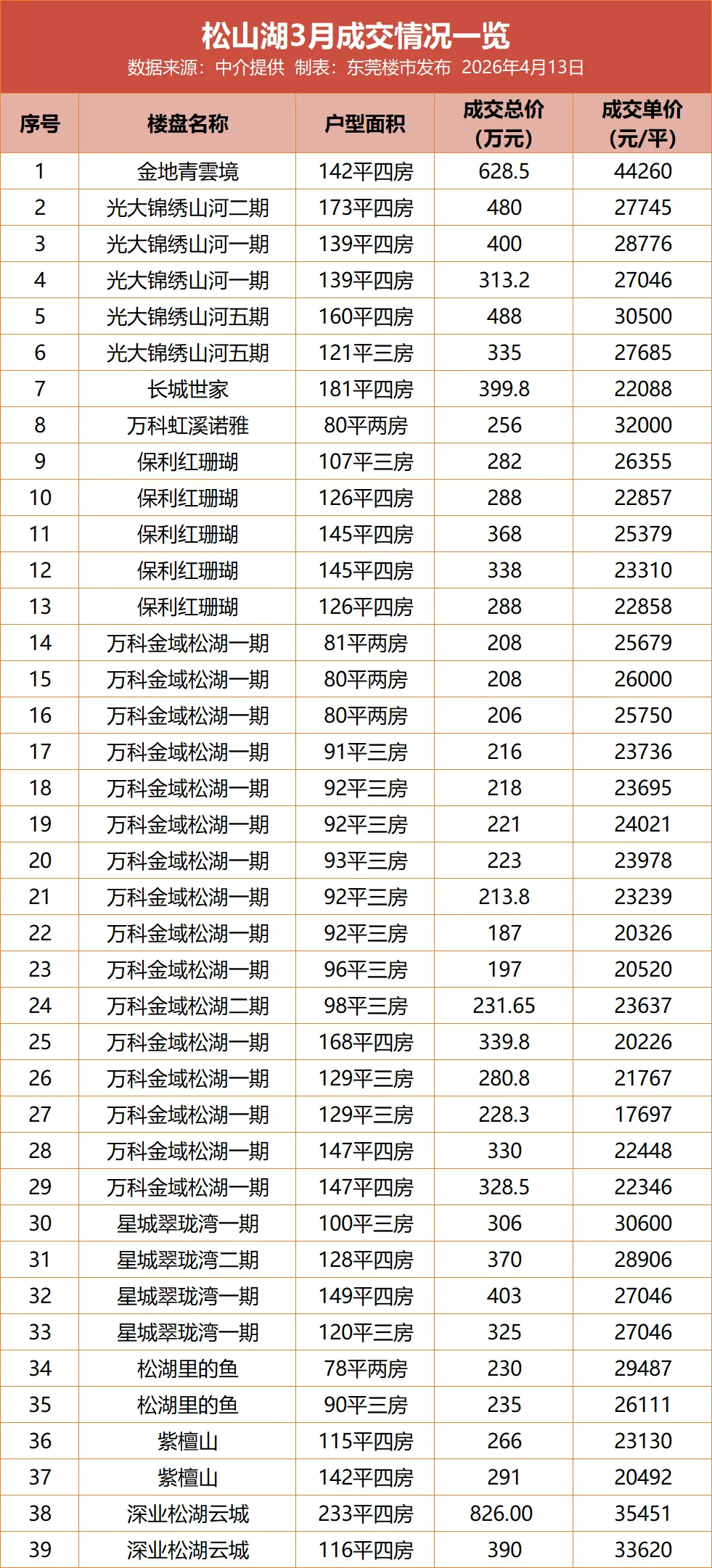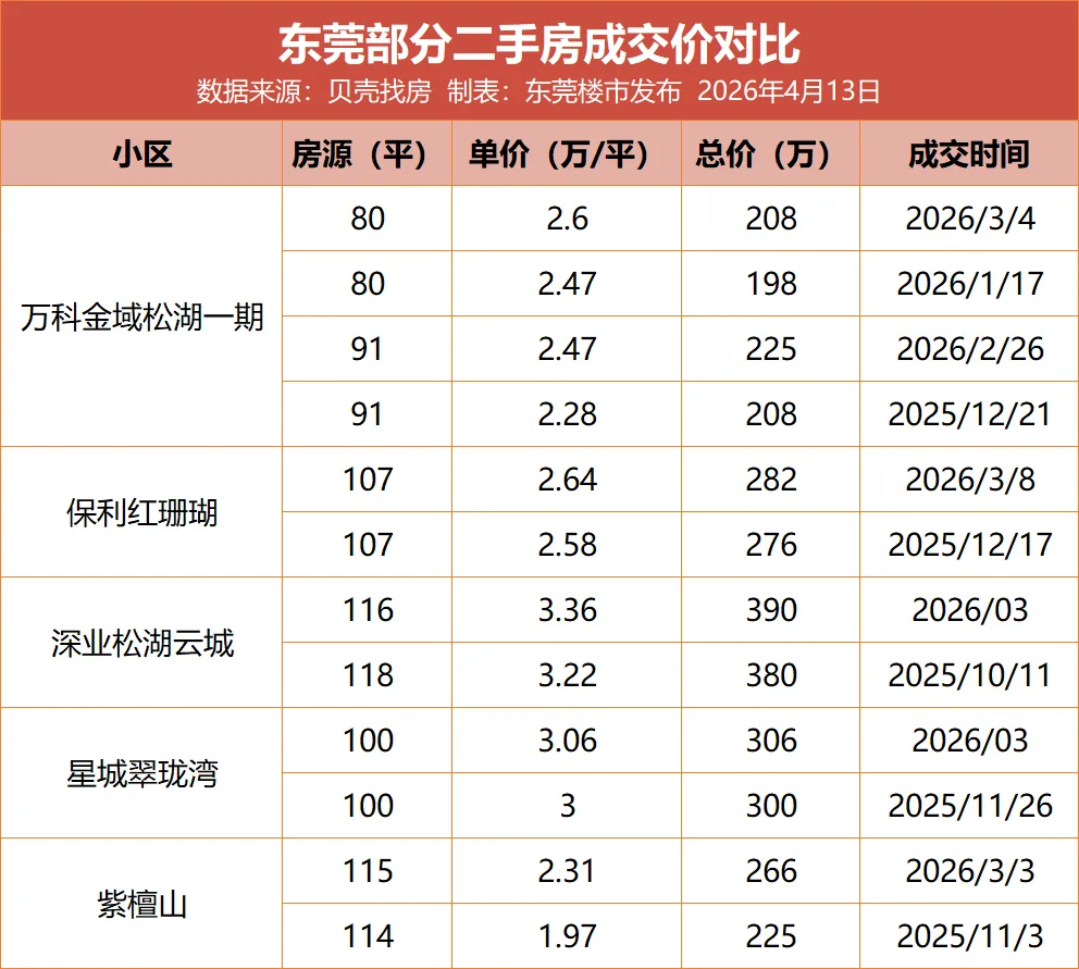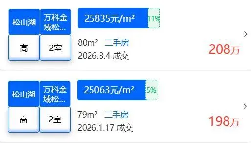 而且,如果仔细观察近期成交情况,松山湖二手房市场有两个明显变化:1、多个热门小区价格反弹,同面积户型涨价幅度6万到41万不等。比如万科金域松湖一期,3月最新成交的这套80平两房,比1月那套高了10万,折合每平涨价1300元。 91平的三房也在涨,最新成交价为225万元,比去年12月份涨了17万。还有保利红珊瑚107平户型,最近成交也比2个月前那套涨了6万。南部的紫檀山也开始止跌,近期一套115平三房卖到2.3万/平+,比上一套同户型贵了41万,成交价重回2字头。次新房深业松湖云城也率先回升,比如116平4房,今年3月和去年10月成交价差10万。不难发现,松山湖二手房价格正在筑底反弹,部分小区已率先回暖。