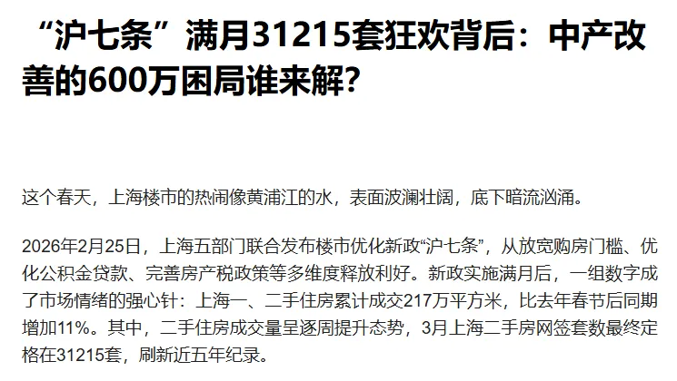 沪七条政策释放的是存量需求,冲一波可能就没了,3月成交高,不代表4月、5月还能高,接下来大概率会回落;别看到新闻就焦虑,生怕错过抄底机会。