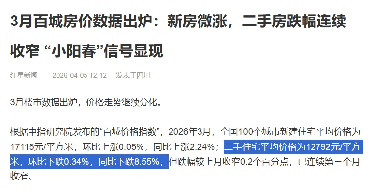 中指研究院数据显示,3月百城二手房均价环比下跌0.34%,同比下跌8.55%,虽然跌幅收窄,但依旧没有止跌;