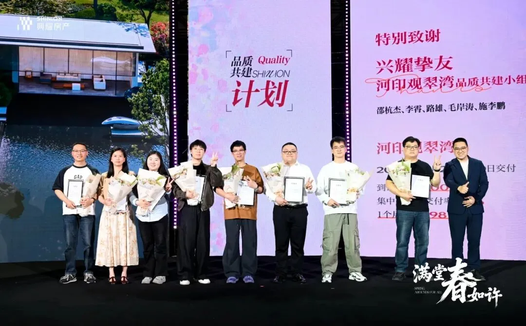 这个4月,是业主「品质共建计划」发起一周年。本次春宴舞台,有个特殊的纪念仪式——兴耀房产集团总经理王奕,为月琉璃、河印观翠湾两个品质共建小组10名成员颁发荣誉证书,并献上鲜花,感谢业主代表们为两个项目的高品质交付做出的贡献。聆听业主声音,与业主共创产品品质建设,通过定期沟通、工地开放、意见反馈等机制,将业主从旁观者,变成了产品的监督者和建议者。