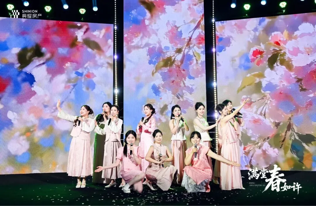 最后,由11位美好的女性组成的小合唱团,给这次春宴画上了一个清新柔美的句点,登台的业主全部都是生活中的声乐爱好者,因共同的兴趣而相聚在春宴的舞台上;一首美好轻盈的《立春》,用动听婉转的歌喉传递出春天的盎然生机。