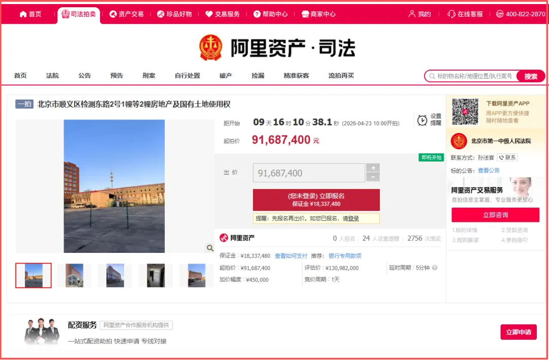 北京青年报记者昨日从淘宝·阿里资产官网获悉,顺义区南法信镇检测东路2号1幢等2幢房地产及国有土地使用权将于4月23日起进行公开司法拍卖,该标的含出让土地、租赁土地及地上两幢建筑,房屋总建筑面积达17716.87平方米,总评估价值13167.26万元。本次拍卖起价9000万元,平均单价7393元/平方米。